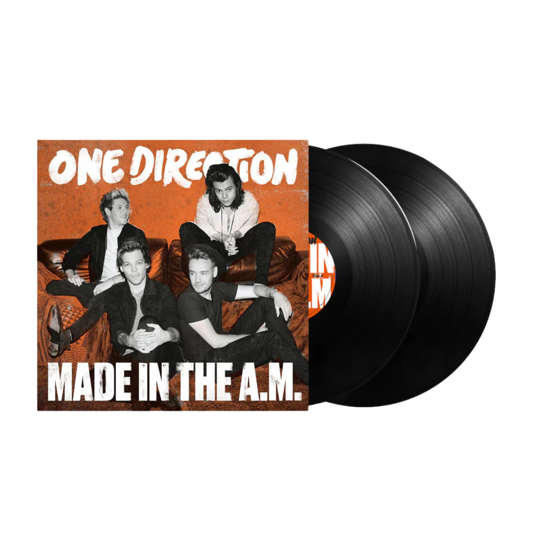 LP de vinilo. Lanzamiento de 2015, el quinto álbum de la banda de chicos británico-irlandesa. Made In The A.M. es el primer álbum del grupo sin Zayn Malik, quien dejó la banda en marzo de 2015, y será el último antes de tomarse un descanso prolongado en 2016 después de promocionar este álbum. El álbum incluye el primer sencillo "Drag Me Down", que ya ha demostrado ser uno de sus mayores éxitos. La banda tiene 65 millones en ventas en todo el mundo y se ha presentado ante un público que supera los 7,5 millones. Son el primer grupo en la historia en tener sus primeros cuatro álbumes debutando en el puesto número 1.